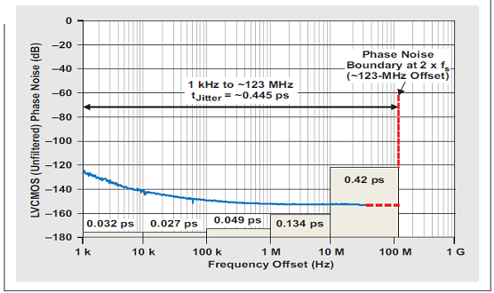 將不同轉角頻率的低通濾波器用于 ADS54RF63 的采樣時鐘(如圖 18 所示),得到了一些如表 7 所列有趣值。該試驗結果表明,LVCMOS 輸出對時鐘抖動的相位噪聲影響被限制在約 200 到 250 MHz,其相當于 122.88-MHz 時鐘信號的 80-MHz 到 130-MHz 偏移頻率,并約為 2x 采樣頻率。因此,將寬帶相位噪聲擴至 123-MHz 偏移頻率,會產生 ~445 fs 的時鐘抖動,如圖 19 所示。理想情況下,積分下限應該位于 500 Hz 處(原因是選擇的 131000點FFT);但是,500-Hz 到 1 kMz 偏移頻率的抖動貢獻值極其低,因此為了簡單起見其在本測量中被忽略。