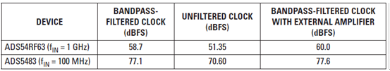 本文介紹了使用某個濾波或未濾波時鐘源時,如何正確地估算數據轉換器的 SNR。表 9 概括了得到的結果。盡管時鐘輸入的帶通濾波器對于最小化時鐘抖動是必要的,但實驗表明它會降低時鐘轉換速率,并使 ADC 的孔徑抖動降級。因此,最佳的時鐘解決方案應包括一個限制相噪影響的帶通濾波器,以及一定的時鐘振幅放大和轉換速率,目的是最小化 ADC 的孔徑抖動。