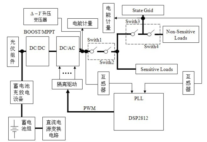 微網(wǎng)逆變器系統(tǒng)將可再生能源(如太陽(yáng)能,風(fēng)能,水能,地?zé)崮埽镔|(zhì)能等)轉(zhuǎn)變?yōu)榕c電網(wǎng)同頻、同相的交流電,優(yōu)先輸送給當(dāng)?shù)刎?fù)荷供電,剩余的電能饋入電網(wǎng)。微網(wǎng)逆變器系統(tǒng)主要包括:光伏組件,蓄電池組,蓄電池充放電設(shè)備,DC/DC 變換器,微網(wǎng)逆變器,靜態(tài)開關(guān)等。