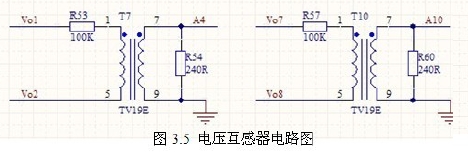 此系統(tǒng)輸出是三相交流電,輸出線電壓為380V,故選擇TV19E 電壓互感器,其輸出負(fù)載電阻可以接0~500 歐,輸出交流電壓0~2.5V,此系統(tǒng)采用240 歐的電阻,輸出電壓-1.2V~1.2V。滿足DSP 的輸入要求。電路如圖3.5 所示。