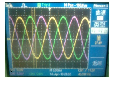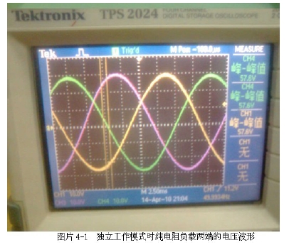 光伏并網(wǎng)發(fā)電系統(tǒng)要實(shí)現(xiàn)并網(wǎng),必須使逆變輸出與電網(wǎng)電壓的幅度、相位與頻率達(dá)到一致,否則將會(huì)使電網(wǎng)諧波增加、電能質(zhì)量下降,并產(chǎn)生并網(wǎng)環(huán)流,甚至造成光 伏發(fā)電系統(tǒng)的損壞。因此在并網(wǎng)過(guò)程中必須進(jìn)行同步鎖相控制、輸出電壓幅度控制以滿足并網(wǎng)的要求。根據(jù)IEEE Std 1547-2003 規(guī)定最大相位誤差為20 度,瞬時(shí)電壓誤差不能超過(guò)電網(wǎng)電壓的10%、最大頻率誤差不能超過(guò)0.3Hz。圖片4-1為獨(dú)立工作模式時(shí)純電阻負(fù)載兩端的電壓波形。