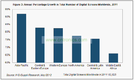 去年亞太地區數字電影增長高達92%,中東/非洲市場增長約66%,如圖3所示。本報告定期追蹤的其它地區包括中歐與東歐;西歐;包括加拿大和美國在內的北美地區;中美洲與拉美。