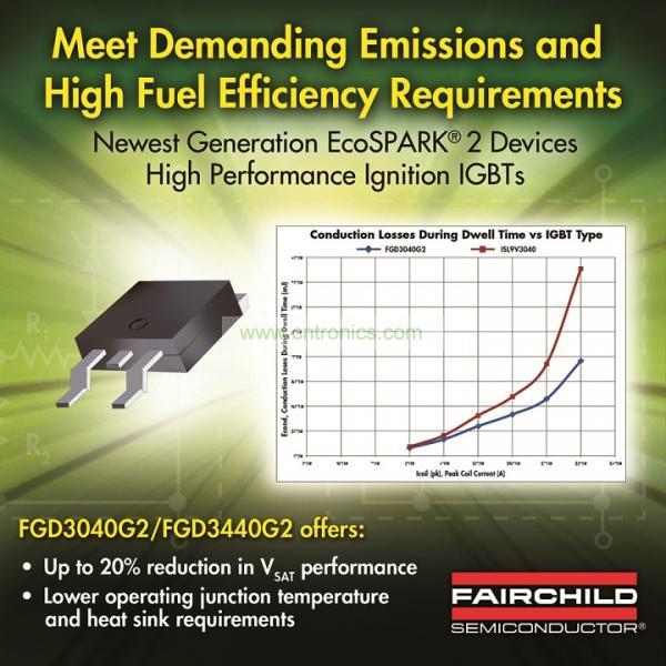 為了滿足現今和新興點火系統對排放和高燃油效率的嚴苛要求,汽車設計人員需要更高性能的點火線圈驅動器技術。為幫助設計人員滿足這些要求,飛兆半導體公司推出了在較小的占位面積下具有更低功耗的最新一代點火IGBT器件。EcoSPARK2、FGD3040G2和FDG3440G2點火線圈驅動器可將VSAT降低多達20%,而不會顯著降低自箝位感性負載開關(Self Clamping Inductive Switching, SCIS) 的能量。這項優化特性減低了功耗和工作結溫,并降低了對散熱器的要求。