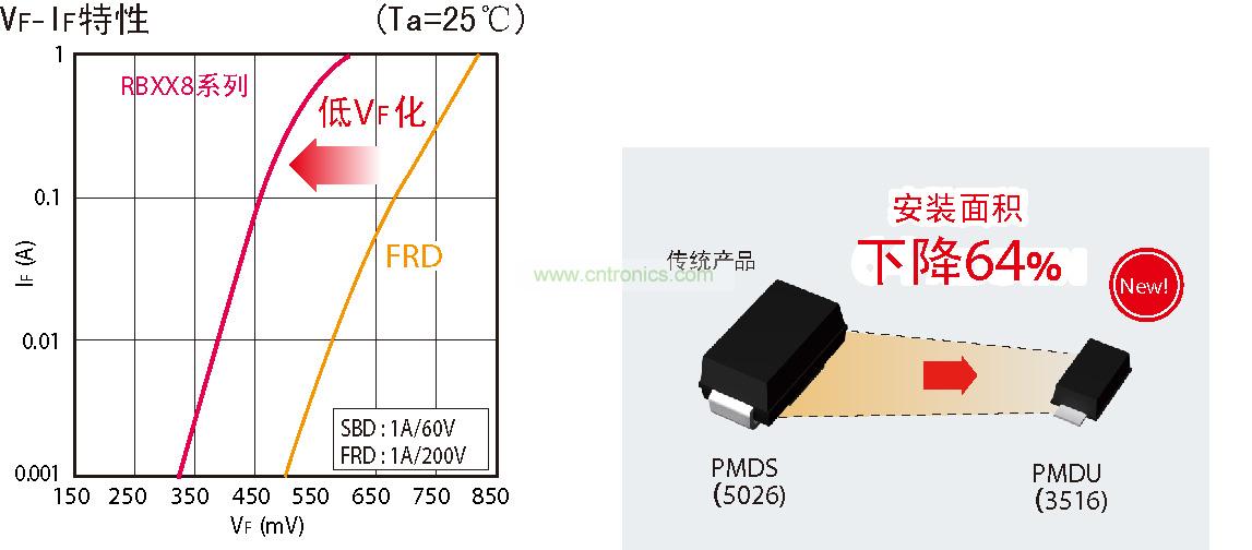 與一般用于車載的FRD相比,VF降低約40%。有助于降低功耗。
