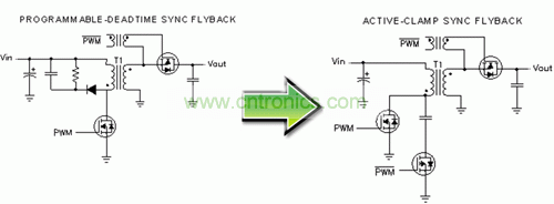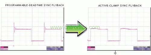 圖 4 描述了如何進一步提高效率并利用同步 MOSFET 柵極驅動信號來控制一個有源主緩沖器。這種結構通常被稱為有源鉗位反向結構。在前面示意圖中,我們已經使用 RCD 緩沖器來降低一次側 MOSFET 漏-源-電壓的電壓峰值。該電壓峰值出現在一次側 MOSFET 關閉時,這主要是由于變壓器主繞組的泄露能量造成的。RCD 緩沖器消耗了其緩沖器電阻中的這種能量。在有源鉗位反向結構中,泄露能量由鉗位電容捕獲,并被帶至負載再循環,最后返回到輸入。這就構成了一個實際上無損耗的緩沖器。RCD 緩沖器的漏-源極-電壓波形和一個有源鉗位的對比關系如圖 5 所示。該有源鉗位消除了高頻峰值。除消除漏能損耗以外,開關損耗和 EMI 也得到了極大降低。在許多情況下,這種有源鉗位緩沖器允許使用低漏-源-電壓額定值的一次側 MOSFET,從而進一步降低了損耗,并有可能降低 MOSFET 的成本。