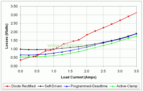 圖 6 顯示了每次二極管整流反向結構升級對實際設計效率的提升程度。電源將一個遠距通信 48VDC 輸入轉換為一個 3.5A 最大負載電流的 3.3V 輸出。將一個二極管整流器轉換為一個自驅動同步反向結構使最大負載效率提高超過 7%,但也確實降低了 1A 以下輸出電流的輕負載效率。這是由于同步 MOSFET 帶來了柵極驅動損耗、開關損耗和直通損耗。如圖 7 所示,輕負載狀態下這些損耗在總損耗中占較大百分比,從而降低了輕負載的效率。使用可編程延遲消除了直通損耗,從而極大地提高了輕負載的效率,如圖 7 所示。由于其他電路損耗在同步 MOSFET 損耗中占主導地位,因此滿負載效率保持基本不變。最終,有源鉗位的實施提高了所有負載條件下 3.3V 電源的效率。