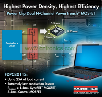 張瑞斌向記者介紹:“FDPC8011S專(zhuān)為更高的開(kāi)關(guān)頻率的應(yīng)用而開(kāi)發(fā),在一個(gè)采用全Clip封裝內(nèi)集成1.4m? SyncFETTM 技術(shù)和一個(gè)5.4m?控制MOSFET、低質(zhì)量因子的N溝道MOSFET,有助于減少同步降壓應(yīng)用中的電容數(shù)量并減小電感尺寸。該器件具有源極朝下和低側(cè)MOSFET可以實(shí)現(xiàn)簡(jiǎn)單的布局和布線(xiàn),提供更緊湊的線(xiàn)路板布局并獲得最佳的散熱性能。”FDPC8011S具有超過(guò)25A的輸出電流,與其它普通3x3mm2 雙MOSFET器件相比,輸出電流容量提高了2倍。
