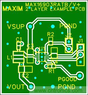 針對開關穩(wěn)壓器MAX16903(圖9)外圍元件的合理布局,有助于從源頭降低噪聲和電磁輻射,有助于節(jié)約項目評估階段的寶貴時間,簡化設計。