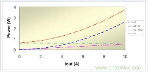 如果意識(shí)到電源損耗與輸出電流相關(guān)(可用輸出電流替換 X),那么系數(shù)項(xiàng)就能很好地與不同來(lái)源的電源功率損耗聯(lián)系起來(lái)。例如,ao 代表諸如柵極驅(qū)動(dòng)、偏壓電源和磁芯的固定開(kāi)銷(xiāo)損耗以及功率晶體管 Coss 充電與放電之類的損耗。這些損耗與輸出電流無(wú)關(guān)。第二項(xiàng)相關(guān)聯(lián)的損耗 a1 直接與輸出電流相關(guān),其典型表現(xiàn)為輸出二極管損耗和開(kāi)關(guān)損耗。在輸出二極管中,大多數(shù)損耗是由于結(jié)電壓引起的,因此損耗會(huì)隨著輸出電流成比例地增加。