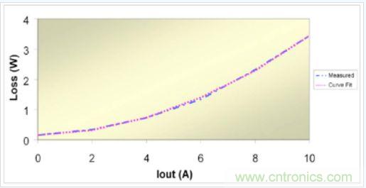 實(shí)際損耗與三項(xiàng)式之間的相關(guān)性非常好。圖 2 對(duì)同步降壓穩(wěn)壓器的測(cè)量數(shù)據(jù)與曲線擬合數(shù)據(jù)進(jìn)行了對(duì)比。我們知道,在基于求解三個(gè)聯(lián)立方程組的曲線上將存在三個(gè)重合點(diǎn)。對(duì)于曲線的剩余部分,兩個(gè)曲線之間的差異小于2%。由于工作模式(如連續(xù)或非連續(xù))不同、脈沖跳頻或變頻運(yùn)行等原因,其他類型的電源可能很難以如此匹配。這種方法并非絕對(duì)可靠,但是有助于電源設(shè)計(jì)人員理解實(shí)際電路損耗情況。