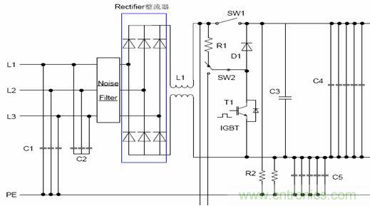 電源系統是指將輸入系統的動力電源轉換成用于驅動交流電機的直流或交流電源,根據實際控制方式的不同,一般可以分為“交直交”電壓源型逆變電路,“交直交”電流源型逆變電路,“交交”型變頻電路以及泵電源電路等。圖1是“交直交”電壓源型電源系統的典型電路,如果將并聯的濾波電容去掉,在直流側串聯一個大濾波電感則為“交直交”電流源型電路。