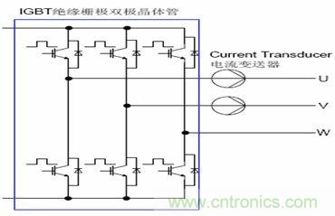 功率開關器件通過根據來自微處理器板的控制信號控制大功率輸出器件的關斷和導通,來實現對交流電機的輸出電流和電壓的控制。根據控制方式的不同,其輸出方式由方波輸出逐漸發展到PWM輸出或SPWM輸出。開關器件也由原來的GTR,MOSFET,發展到IGBT,IPM等。參見下面的典型IGBT逆變輸出電路。