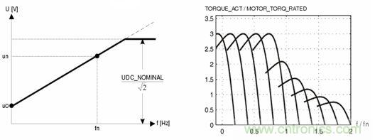 當電機在額定頻率以上調速時,逆變器的輸出頻率可以繼續升高,但是輸出端電壓只能維持在額定輸入值,此時定子磁通和調速頻率成反比下降,異步電機的工作狀態等同于直流電機的弱磁升速,電機的輸出扭矩隨磁通變化,輸出扭矩隨速度增加逐漸變小為恒功率工作模式。