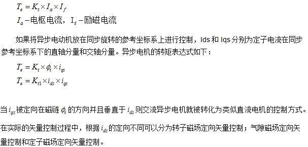 矢量控制是指根據電機運行狀況同時控制輸出量的幅值和相位。其基本的工作原理是通過電機內以同步轉速旋轉的參考d-q參考坐標系的數學方法,解藕出控制電機勵磁方向的電流分量Id和控制電機的轉矩方向的分量Iq,從而可以將異步電機的控制方法等效為傳統直流電機的控制。