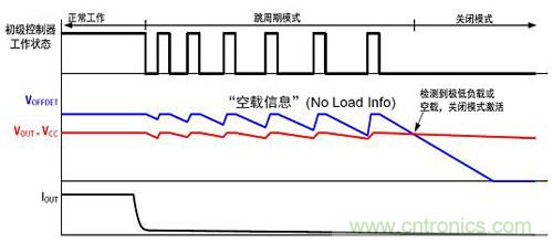 圖1是進(jìn)入關(guān)閉模式的過程。當(dāng)輸出電流從滿載慢慢降低時(shí),初級(jí)控制器會(huì)從正常工作轉(zhuǎn)換成跳周期工作,輸出電壓和空載信息基本上比較接近;當(dāng)輸入極低跳周期或關(guān)閉模式時(shí),輸出空載電壓將低于輸出電壓,從而檢測(cè)到極低負(fù)載或空載,激活關(guān)閉模式。