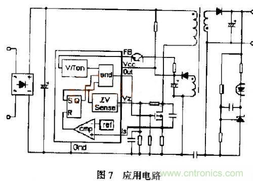 由(9),(10)或可知,調節輸出功率、穩定輸出電壓可以調節導通時間或占空比或調頻方式或幾種方式綜合應用。當輸出功率下降或電源電壓上升,導通時間減小,反之導通時間增加;隨輸出功率的增加或減小變壓器初次級電流峰值均增加或減小,由式(3)可知變壓器的釋放儲能時間也隨之增加或減少,為實現“零電壓”開關,變壓器不能工作在間歇狀態,因此F%IM控制方式不能滿足本文電路的“零電壓”開通的要求。基于上述工作條件的約束,本文電路應采用輸出電壓反饋控制導通時間,用“零電壓”檢測控制開關管導通時刻,即調頻、調占空比工作方式。具體電路可以采用通用器件組合,如圖7。