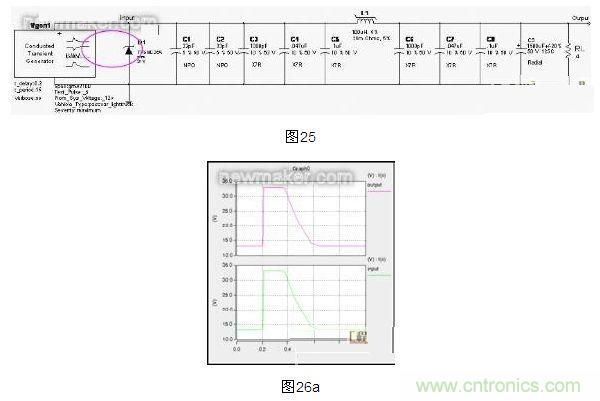 2) 脈沖2a 模擬由于線束電感的原因,使與DUT并聯的裝置內電流突然中斷引起的瞬態現象;脈沖2b 模擬直流電機充當發電機,在點火開關斷開時的瞬態現象。仿真結果見圖15a。