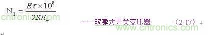 (2-17)和(2-18)式,為計算雙激式開關(guān)變壓器初級線圈N1繞組匝數(shù)的公式。式中,N1為變壓器初級線圈N1繞組的最少匝數(shù),S為變壓器鐵芯的導(dǎo)磁面積(單位:平方厘米),Bm為變壓器鐵芯的最大磁感應(yīng)強(qiáng)度(單位:高斯),τ為脈沖寬度,或電源開關(guān)管的導(dǎo)通時間(單位:秒),E為脈沖電壓的幅度,單位為伏,F(xiàn)為開關(guān)電源的工作頻率,單位赫芝。