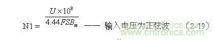 (2-19)式為計算正弦波電源變壓器初級線圈N1繞組匝數(shù)的公式。式中,N1為變壓器初級線圈N1繞組的最少匝數(shù),S為變壓器鐵芯的導(dǎo)磁面積(單位:平方厘米),Bm為變壓器鐵芯的最大磁感應(yīng)強(qiáng)度(單位:高斯),U為正弦波輸入電壓有效值,單位為伏,F(xiàn)為正弦波的頻率,單位赫芝。