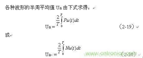 (2-19)、(2-20)式中,Ua和Ua-分別為各種波形的正、負(fù)半周平均值,Pu(t)和Nu(t)分別為各種波形的正波形函數(shù)(正半周)和負(fù)波形函數(shù)(負(fù)半周),T為所選波形的周期。大部分交流電壓波形,其正、負(fù)半周平均值的絕對值都相等,但符號相反。