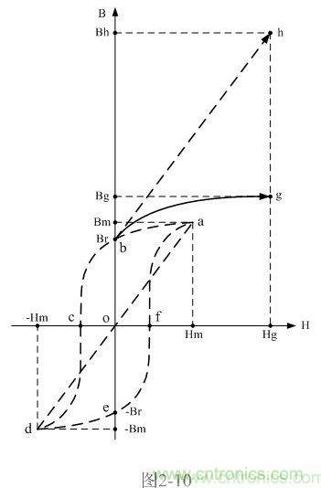 在圖2-10中,虛線表示的磁化曲線a-b-c-d-e-f-a為雙激開關(guān)變壓器鐵芯正常工作時的磁滯回線,虛線線段d-a是把開關(guān)變壓器鐵芯的磁化曲線理想化后得到的一條曲線(直線),理想磁化曲線是一條斜率等于最大磁感應(yīng)強(qiáng)度增量與最大磁場強(qiáng)度增量之比,且經(jīng)過坐標(biāo)原點(diǎn)的直線;當(dāng)直線不經(jīng)過坐標(biāo)原點(diǎn)時,這條直線可稱為等效磁化曲線(如線段bh)。理想磁化曲線只有一條,但等效磁化曲線卻有無數(shù)多條,且每條效磁化曲線均與理想磁化曲線平行。