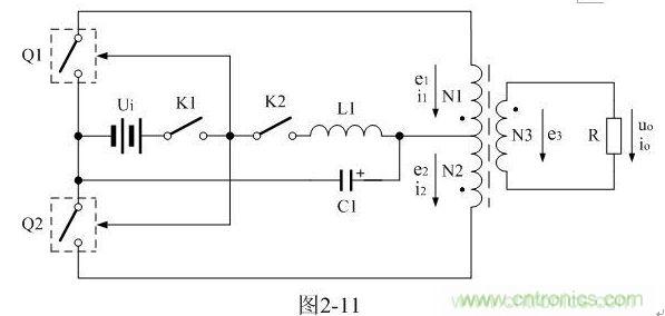 在圖2-11中,開機(jī)時,驅(qū)動電路電源開關(guān)K1首先接通,電源Ui首先給電源開關(guān)管Q1、Q2的驅(qū)動電路加電;然后開關(guān)管電源開關(guān)K2接通,由于L1的作用,C1兩端的電壓只能緩慢上升,以保證加到變壓器初級線圈的電壓不會突然升高,使流過變壓器初級線圈的電流過大,導(dǎo)致變壓器鐵芯出現(xiàn)飽和;關(guān)機(jī)時,開關(guān)管電源開關(guān)K2首先關(guān)斷,而后驅(qū)動電路電源開關(guān)K1再關(guān)斷,由于C1兩端的電壓緩慢下降,使變壓器鐵芯可進(jìn)行充分退磁,以保證下次開機(jī)的時候,變壓器鐵芯磁滯回線的初始相位總是從0開始。