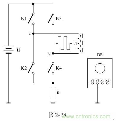 圖2-28中,U是電源電壓,N為變壓器初級線圈,控制開關K1、K2、K3、K4組成橋式開關控制電路,K1和K4為一組,K2和K3為一組,兩組開關輪流接通與斷開,把電源電壓正反向加于變壓器初級線圈兩端;R為取樣電阻,通過測量R兩端的電壓,就可以知道流過變壓器初級線圈的電流;取樣電壓被送到示波器DP進行顯示。