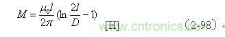 【說明】互感M有正負,圖2-41-a和圖2-41-c的接法互感M為正,圖2-41-b和圖2-41-d的接法互感M為負。兩個線圈之間的互感M為: