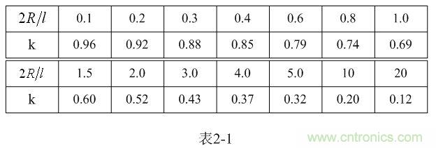 【說明】上式是用來計算多層線圈繞組、截面為圓形的空心線圈的電感計算公式。長岡系數k可查閱表2-1,系數c可查閱表2-2。當線圈內部有鐵芯時,有鐵芯線圈的電感是空心線圈電感的