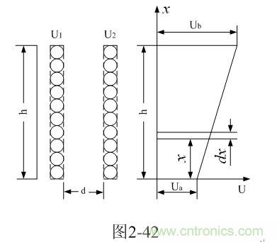 圖2-42是分析計算開關變壓器線圈之間分布電容的原理圖。
