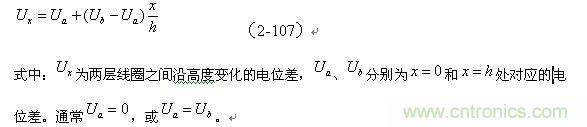 設圓柱形兩層線圈之間的距離為d,高度為h,平均周長為g 。假定兩層線圈之間沿高度的電位差為線性變化,即: