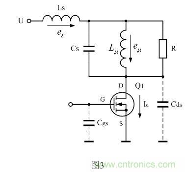 因此,當開關管剛開始導通時,流過開關管的電流是由小變大,這個過程,與在電感兩端加一電壓方波時,流過電感的電流由小變大很相似;所以,在開關管剛導通的一瞬間,開關管的漏極和源極之間可以等效成一個電感Lds。由于這個電感相對分布電感Ls和勵磁電感Lu 來說很小,所以圖3中沒有畫出。