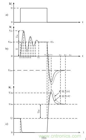 這里順便指出,圖6-b的波形是很難測量到的,因為分布電感Ls與分布電容Cs產生自由振蕩的過程,基本上都在變壓器內部的分布電感與分布電容之間進行,用儀器很難直接進行測量;但通過測量變壓器次級線圈的波形,也可以間接測量圖6-b中波形的振幅;而圖6-c的波形可以直接進行測量,兩者的振幅均與分布電感Ls的數值大小有關,還與等效電阻R的阻值有關。分布電感Ls的數值越大,振幅也越大,等效電阻R的阻值越大,振幅也越大。