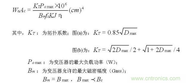 從面積積公式可知,副邊有續流二極管的變壓器,其拓撲系數小一些,如對于Dmax=0.45,KT(a)=0.57,KT(b)=0.58