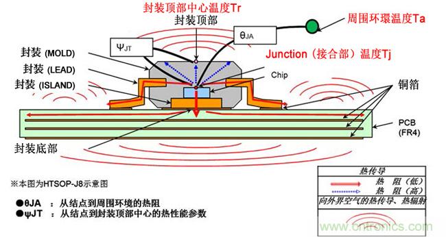 通常,只要知道PCB板貼裝時IC的熱阻θJA和功耗,或封裝頂部中心溫度TT熱性能參數ΨJT,即可知道IC大致的結點(接合部)溫度Tj。如何將該結點溫度Tj控制在絕對最大額定值以下是熱設計的根本。