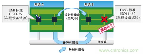 因此,對車載用產品來說,不妨礙其他設備(發射干擾)、以及受到其他設備妨礙時能保持本來的性能(抗干擾)是非常重要的。