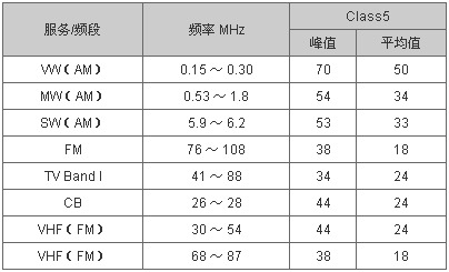 CISPR25傳輸干擾的極限值dB(µV)