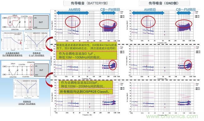 在圖6的示例中,對于AM頻段噪音,使用Π型濾波器使之衰減;對于CB~FM頻段噪音,選用諧振頻率在20MHz左右的旁路電容使之衰減,以滿足CISPR25-Class5要求。