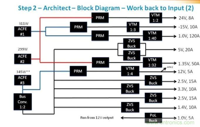 在這里,我們看到現在引入了驅動電壓軌的ACFE。這里非常重要的是判斷每路電壓軌上的負載,并確保負載均操作于接近具有合適安全裕度的最大值。
