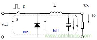 當(dāng)開(kāi)關(guān)斷開(kāi)時(shí),由于電感上的電流不能突變,電感電流就通過(guò)二極管D續(xù)流,該二極管稱為續(xù)流二極管,這樣就實(shí)現(xiàn)了對(duì)原先流過(guò)開(kāi)關(guān)管電流的續(xù)流,同時(shí)電感中存儲(chǔ)的一部份能量向負(fù)載釋放。續(xù)流電流環(huán)包括:二極管,電感,負(fù)載。在這階段流過(guò)電感上的電流用下式描述: