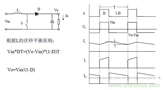 升壓變換器與BUCK變換器有著相同的組成部份,只是它們的位置被重新布置了一下。新的布局使變換器與正激式變換器的工作過(guò)程完全不同。在這種情況下,開(kāi)關(guān)管導(dǎo)通時(shí),電流環(huán)路僅在包括電感,開(kāi)關(guān)管和輸入電壓源。在這段時(shí)間中,二極管是反向阻斷的。電感電流波形也是以固定斜率上升,可用下式描述: