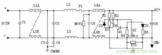 ② R1、R2、R3、Z1、C6、Q1、Z2、R4、R5、Q2、RT1、C7組成抗浪涌電路。在起機的瞬間,由于C6的存在Q2不導通,電流經RT1構成回路。當C6上的電壓充至Z1的穩(wěn)壓值時Q2導通。如果C8漏電或后級電路短路現(xiàn)象,在起機的瞬間電流在RT1上產生的壓降增大,Q1導通使Q2沒有柵極電壓不導通,RT1將會在很短的時間燒毀,以保護后級電路。