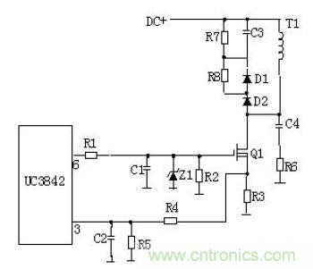 R4、C3、R5、R6、C4、D1、D2組成緩沖器,和開關MOS管并接,使開關管電壓應力減少,EMI減少,不發(fā)生二次擊穿。在開關管Q1關斷時,變壓器的原邊線圈易產生尖峰電壓和尖峰電流,這些元件組合一起,能很好地吸收尖峰電壓和電流。從R3測得的電流峰值信號參與當前工作周波的占空比控制,因此是當前工作周波的電流限制。當R5上的電壓達到1V時,UC3842停止工作,開關管Q1立即關斷。