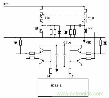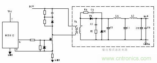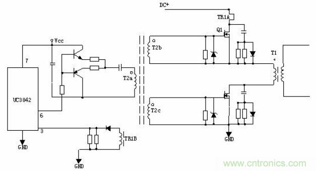 5、有驅動變壓器的功率變換電路:T2為驅動變壓器,T1為開關變壓器,TR1為電流環(huán)。