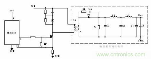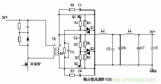 T1為開關變壓器,其初極和次極的相位同相。D1為整流二極管,D2為續(xù)流二極管,R1、C1、R2、C2為削尖峰電路。L1為續(xù)流電感,C4、L2、C5組成π型濾波器。