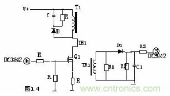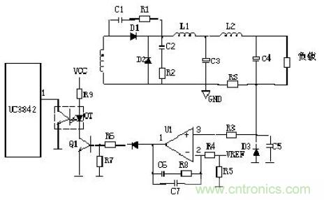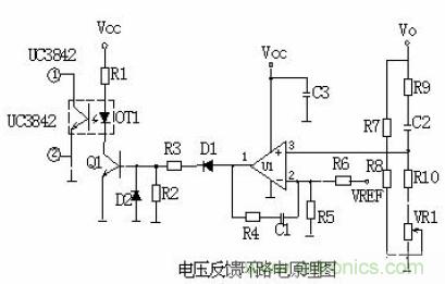 當輸出U0降低時,U1③腳電壓降低,當其低過U1②腳基準電壓后U1①腳輸出低電平,Q1不導通,光耦OT1發(fā)光二極管不發(fā)光,光電三極管不導通,UC3842①腳電位升高,從而改變U1⑥腳輸出占空比增大,U0降低。周而復始,從而使輸出電壓保持穩(wěn)定。調節(jié)VR1可改變輸出電壓值。