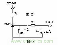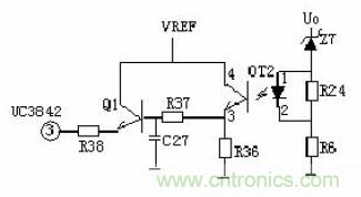 當輸出U0升高,經取樣電阻R7、R8、R10、VR1分壓后,U1③腳電壓升高,當其超過U1②腳基準電壓后U1①腳輸出高電平,使Q1導通,光耦OT1發(fā)光二極管發(fā)光,光電三極管導通,UC3842①腳電位相應變低,從而改變U1⑥腳輸出占空比減小,U0降低。