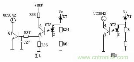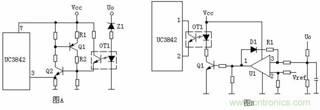 圖A的工作原理是,當輸出電壓Uo升高,穩(wěn)壓管導通,光耦導通,Q2基極得電導通,由于Q2的導通Q1基極電壓降低也導通,Vcc電壓經R1、Q1、R2使Q2始終導通,UC3842③腳始終是高電平而停止工作。在圖B中,UO升高U1③腳電壓升高,①腳輸出高電平,由于D1、R1的存在,U1①腳始終輸出高電平Q1始終導通,UC3842①腳始終是低電平而停止工作。正反饋?