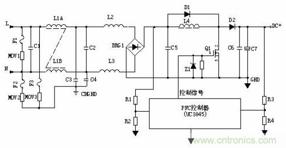 輸入電壓經L1、L2、L3等組成的EMI濾波器,BRG1整流一路送PFC電感,另一路經R1、R2分壓后送入PFC控制器作為輸入電壓的取樣,用以調整控制信號的占空比,即改變Q1的導通和關斷時間,穩(wěn)定PFC輸出電壓。L4是PFC電感,它在Q1導通時儲存能量,在