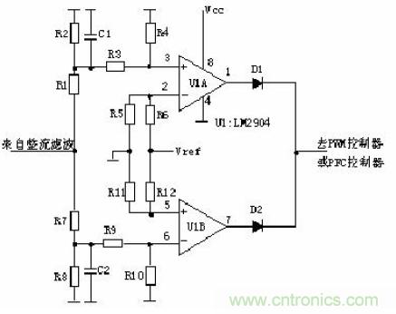 Q1關斷時施放能量。D1是啟動二極管。D2是PFC整流二極管,C6、C7濾波。PFC電壓一路送后級電路,另一路經R3、R4分壓后送入PFC控制器作為PFC輸出電壓的取樣,用以調整控制信號的占空比,穩(wěn)定PFC輸出電壓。